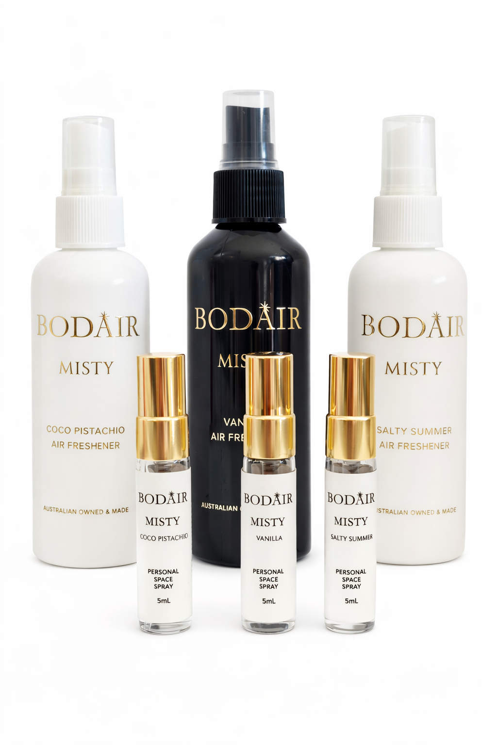 MISTY by BODAIR is a light, fine-mist room and bathroom spray designed to refresh small spaces with a soft, uplifting scent — without feeling heavy, overpowering or artificial.
